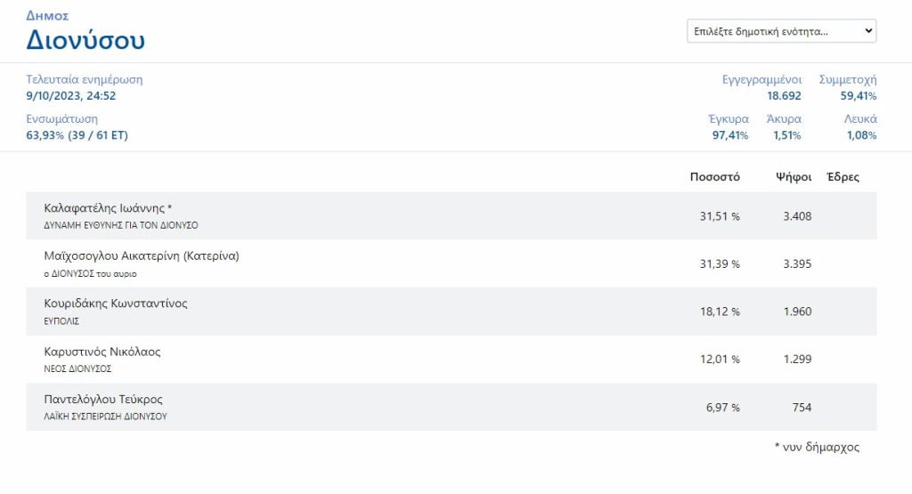 Δημοτικές εκλογές 2023: θρίλερ στον Διόνυσο – Καλαφατέλης και Μαιχόσογλου στον δεύτερο γύρο